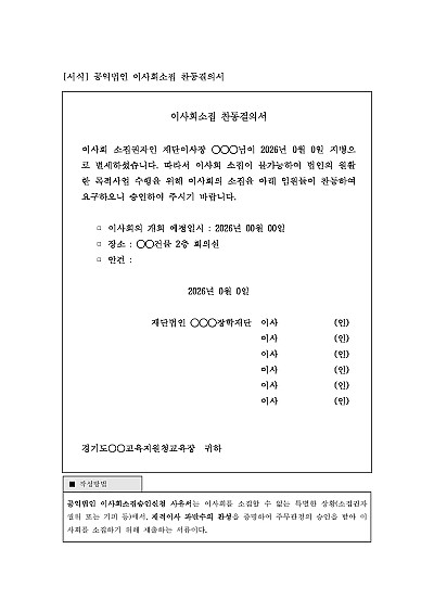 주요내용 : 이사회를 소집할 수 없는 특별한 상황(소집권자 궐위 또는 기피 등)에서, 재적이사 과반수의 찬성을 증명하여 주무관청의 승인을 받아 이사회를 소집하기 위해 제출하는 서류 양식임. 단 무단전재 방지 목적으로 PDF 파일로 올리니, 구매하신 후 혹 원본 파일이 필요하신 분들은 톡이나 문자, 메일, 전화 등을 주시면 작성 방법 등에 대한 간단한 무료 상담과 함께 원본 파일을 보내드리도록 하겠습니다.