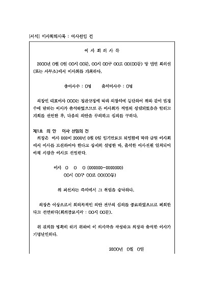 주요내용 사단법인의 이사회가 개최되었을 때회의의 안건진행 경과의결된 결과 등을 공식적으로 기록한 문서출석한 이사와 감사의 기명날인 또는 서명이 필수적임단 무단전재 방지목적으로 PDF 파일로 올리니구매하신 후 혹 원본 파일이 필요하신 분들은 톡이나 문자메일전화 등을 주시면 작성방법 등에 대한 간단한 무료상담과 함께 원본 파일을 보내드리도록 하겠습니다.