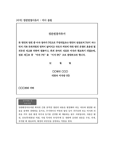 주요내용 : 법인의 근본 규칙인 정관의 내용을 변경해야 하는 이유와 변경할 내용을 상세히 설명하는 문서로, 비영리 법인 등이 주주총회 또는 이사회 의결을 거쳐 정관 변경 허가나 등기를 신청할 때 제출하는 필수 서류임. 단 무단전재 방지목적으로 PDF 파일로 올리니, 구매하신 후 혹 원본 파일이 필요하신 분들은 톡이나 문자, 메일, 전화 등을 주시면 작성방법 등에 대한 간단한 무료상담과 함께 원본 파일을 보내드리도록 하겠습니다.