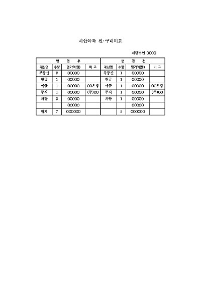 주요내용 : 재산 목록의 변경 전(구) 내용과 변경 후(신) 내용을 비교하여 보여주는 표를 의미히먀. 주로 법인, 재단, 또는 법률 등에서 변경 사항을 명확히 제시하고 승인받기 위해 사용됨. 단 무단전재 방지목적으로 PDF 파일로 올리니, 구매하신 후 혹 원본 파일이 필요하신 분들은 톡이나 문자, 메일, 전화 등을 주시면 작성방법 등에 대한 간단한 무료상담과 함께 원본 파일을 보내드리도록 하겠습니다.