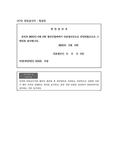 주요내용 : 법인이 해산된 후 잔여업무를 처리하는 청산인으로 선임된 사람이 해당 직책을 맡겠다는 의사를 표시하는 문서 양식임. 단 무단전재 방지목적으로 PDF 파일로 올리니, 구매하신 후 혹 원본 파일이 필요하신 분들은 톡이나 문자, 메일, 전화 등을 주시면 작성방법 등에 대한 간단한 무료상담과 함께 원본 파일을 보내드리도록 하겠습니다.