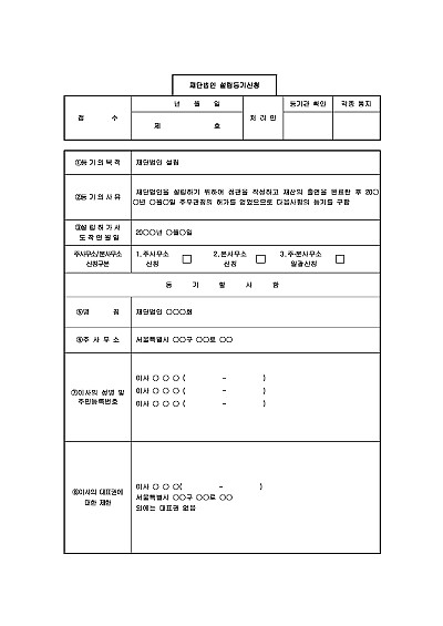 주요내용 : 재단법인을 법적으로 성립시키기 위하여 법원 등기소에 제출하는 서루로, 설립 허가 후 3주 이내에 법인의 목적, 재산, 임원 등의 정보를 기재하고 필요한 서류(정관, 재산 목록, 임원 취임 승낙서 등)를 첨부하여 주된 사무소 소재지 관할 등기소에 제출해야 하는 공식 신청 양식임. 단 무단전재 방지목적으로 PDF 파일로 올리니, 구매하신 후 혹 원본 파일이 필요하신 분들은 톡이나 문자, 메일, 전화 등을 주시면 작성방법 등에 대한 간단한 무료상담과 함께 원본 파일을 보내드리도록 하겠습니다.