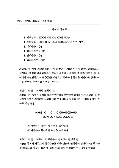 주요내용 : 재단법인의 이사회가 개최되고 의결된 사항들을 기록하는 문서로 이는 회의의 진행 과정, 논의된 안건, 결정된 내용, 참석한 이사와 감사(있는 경우)의 명단 등을 포함하며, 법적 구속력을 가지는 공식 기록물임. 단 무단전재 방지목적으로 PDF 파일로 올리니, 구매하신 후 혹 원본 파일이 필요하신 분들은 톡이나 문자, 메일, 전화 등을 주시면 작성방법 등에 대한 간단한 무료상담과 함께 원본 파일을 보내드리도록 하겠습니다.