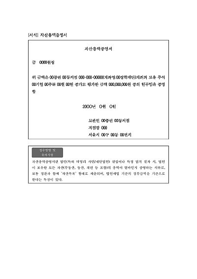 주요내용 : 법인(특히 비영리 사단/재단법인) 설립이나 특정 법적 절차 시, 법인이 보유한 모든 자산(부동산, 동산, 채권 등 포함)의 총액이 얼마인지 증명하는 서류 양식임. 단 무단전재 방지목적으로 PDF 파일로 올리니, 구매하신 후 혹 원본 파일이 필요하신 분들은 톡이나 문자, 메일, 전화 등을 주시면 작성방법 등에 대한 간단한 무료상담과 함께 원본 파일을 보내드리도록 하겠습니다.