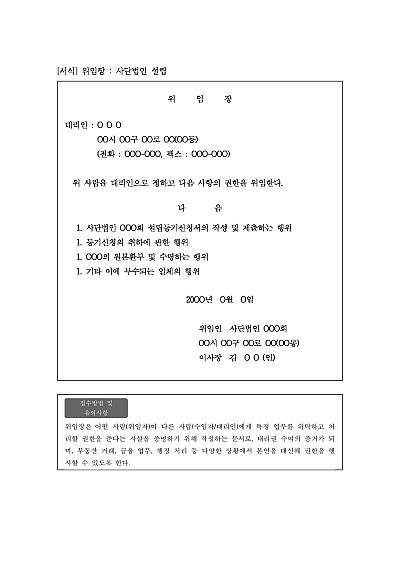 주요내용 : 위임자가 수임자/대리인에게 특정 업무를 위탁하고 처리할 권한을 준다는 사실을 증명하기 위해 작성하는 문서 양식임. 단 무단전재 방지목적으로 PDF 파일로 올리니, 구매하신 후 혹 원본 파일이 필요하신 분들은 톡이나 문자, 메일, 전화 등을 주시면 작성방법 등에 대한 간단한 무료상담과 함께 원본 파일을 보내드리도록 하겠습니다.