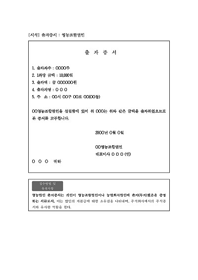 주요내용 개인이 영농조합법인이나 농업회사법인에 출자(투자)했음을 증명하는 서류 양식임단 무단전재 방지 목적으로 PDF 파일로 올리니구매하신 후 혹 원본 파일이 필요하신 분들은 톡이나 문자메일전화 등을 주시면 작성 방법 등에 대한 간단한 무료 상담과 함께 원본 파일을 보내드리도록 하겠습니다.