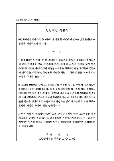 주요내용 : 비영리법인이 민법상 규정된 해산 사유(존립기간 만료, 목적 달성 및 불능, 파산, 설립허가 취소 등)가 발생하여 법인을 해산할 때, 그 해산 사유가 발생했음을 증명하고 주무관청에 신고하기 위해 작성하는 공식 문서임. 단 무단전재 방지 목적으로 PDF 파일로 올리니, 구매하신 후 혹 원본 파일이 필요하신 분들은 톡이나 문자, 메일, 전화 등을 주시면 작성 방법 등에 대한 간단한 무료 상담과 함께 원본 파일을 보내드리도록 하겠습니다.