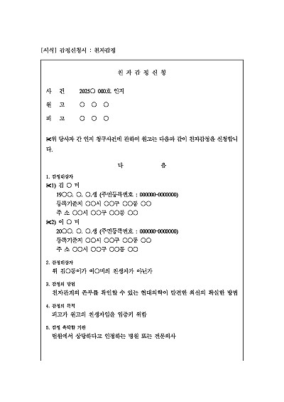 주요내용 : 인지청구나 친자확인, 친생자관계부존재 확인 등 소송에서 상대방과의 친자관계를 확인하기 위한 목적으로 사용되어지는 신청서 양식임. 단 무단전재 방지목적으로 PDF 파일로 올리니구매하신 후 혹 원본 파일이 필요하신 분들은 톡이나 문자메일전화 등을 주시면 작성방법 등에 대한 간단한 무료상담과 함께 원본 파일을 보내드리도록 하겠습니다.