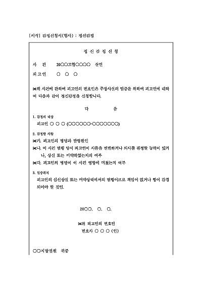 주요내용 : 피고인이 범죄 당시 정상적인 판단 능력을 가지고 있었는지 또는 정신질환으로 인해 행동을 조절할 수 없는 상태였는지 등을 입증하기 위한 목적으로 사용되어지는 신청서 양식임. 단 무단전재 방지목적으로 PDF 파일로 올리니, 구매하신 후 혹 원본 파일이 필요하신 분들은 톡이나 문자, 메일, 전화 등을 주시면 작성방법 등에 대한 간단한 무료상담과 함께 원본 파일을 보내드리도록 하겠습니다.