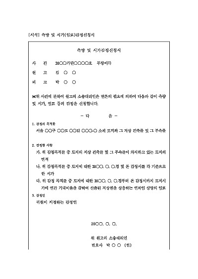 주요내용 : 계쟁물에 대한 정확한 현황 및 그에 대한 시간 그리고 임료 등의 입증을 위한 감정신청시 사용되어지는 신청서 양식임. 단 무단전재 방지목적으로 PDF 파일로 올리니, 구매하신 후 혹 원본 파일이 필요하신 분들은 톡이나 문자, 메일, 전화 등을 주시면 작성방법 등에 대한 간단한 무료상담과 함께 원본 파일을 보내드리도록 하겠습니다.