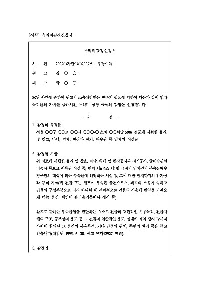 주요내용 : 부동산의 임대차 후 임차인이 목적물의 수선 및 유지 등으로 지출하여 목적물의 가치를 증대시킨 비용을 감정하기 위한 목적으로 사용되어지는 신청서 양식임. 단 무단전재 방지목적으로 PDF 파일로 올리니, 구매하신 후 혹 원본 파일이 필요하신 분들은 톡이나 문자, 메일, 전화 등을 주시면 작성방법 등에 대한 간단한 무료상담과 함께 원본 파일을 보내드리도록 하겠습니다.