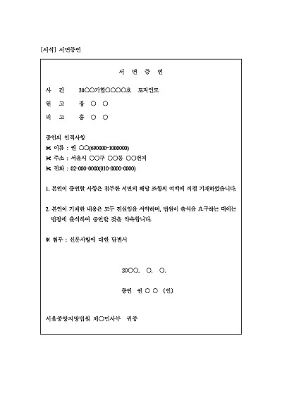 주요내용 증인은 원칙적으로 법정에 출석하여 증언하여야 하나 불가피한 사정이 있는 경우에는 법원의 허가를 받아 서면으로 증언을 대신할 수 있는데, 이때 사용되어지는 양식임. 단 무단전재 방지목적으로 PDF 파일로 올리니구매하신 후 혹 원본 파일이 필요하신 분들은 톡이나 문자메일전화 등을 주시면 작성방법 등에 대한 간단한 무료상담과 함께 원본 파일을 보내드리도록 하겠습니다.