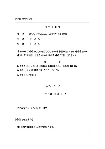 주요내용 : 당해 사건과 관련 된 사실을 알고 있는 제3자를 법정에 출석시켜 주장사실을 입증 또는 항변하기 위한 목적으로 동인의 법정진술을 듣기 위해 사용되어지는 신청서 양식임. 단 무단전재 방지목적으로 PDF 파일로 올리니,구매하신 후 혹 원본 파일이 필요하신 분들은 톡이나 문자, 메일, 전화 등을 주시면 작성방법 등에 대한 간단한 무료상담과 함께 원본 파일을 보내드리도록 하겠습니다.