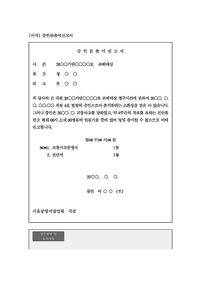주요내용 : 증인으로 소환된 자가 정당한 사유없이 불출석할 경우 과태료 등의 부리익을 받을 수 있기 대문에 만일 정당한 사유로 인해 법정 출석이 어려울 경우 사전에 그 사유를 제출할 때 사용되어지는 신고서(사유서) 양식임. 단 무단전재 방지목적으로 PDF 파일로 올리니구매하신 후 혹 원본 파일이 필요하신 분들은 톡이나 문자메일전화 등을 주시면 작성방법 등에 대한 간단한 무료상담과 함께 원본 파일을 보내드리도록 하겠습니다.