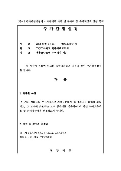 주요내용 : 기존에 제출된 감정평가(부동산 시세, 하자, 기술 등) 결과가 불충분하거나 오류가 있다고 판단될 때, 전문 감정인에게 다른 사항이나 보완된 내용을 다시 감정받기 위한 목적으로 사용되어지는 신청서 양식임. 단 무단전재 방지 목적으로 PDF 파일로 올리니, 구매하신 후 혹 원본 파일이 필요하신 분들은 톡이나 문자, 메일, 전화 등을 주시면 작성 방법 등에 대한 간단한 무료 상담과 함께 원본 파일을 보내드리도록 하겠습니다.