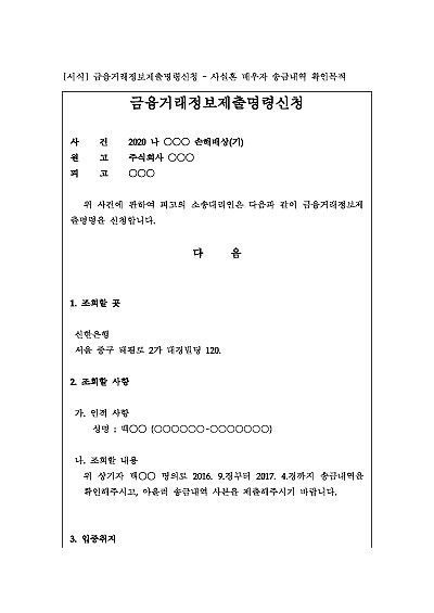 [로펌제작] 금융거래정보제출명령신청 – 사실혼 배우자 송금내역 확인목적 요약정보 및 구매