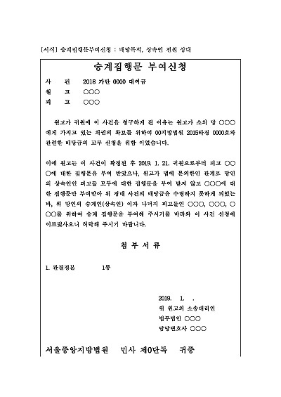 주요내용 : 판결 후 채권자나 채무자가 변경(상속, 채권양도, 법인합병 등)되었을 때, 변경된 당사자(승계인)를 위해 판결문(집행권원)의 집행력을 인정받아 강제집행을 신청하기 위한 목적으로 사용되어지는 신청서 양식임. 단 무단전재 방지 목적으로 PDF 파일로 올리니, 구매하신 후 혹 원본 파일이 필요하신 분들은 톡이나 문자, 메일, 전화 등을 주시면 작성 방법 등에 대한 간단한 무료 상담과 함께 원본 파일을 보내드리도록 하겠습니다.