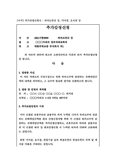주요내용 : 민사소송 등 법적 분쟁 중 기존 감정 결과가 불충분하거나 누락된 부분이 있을 때, 전문가에게 해당 사항을 보완하거나 재감정하도록 법원에 요청할 때 사용되어지는 신청서 양식임. 단 무단전재 방지 목적으로 PDF 파일로 올리니, 구매하신 후 혹 원본 파일이 필요하신 분들은 톡이나 문자, 메일, 전화 등을 주시면 작성 방법 등에 대한 간단한 무료 상담과 함께 원본 파일을 보내드리도록 하겠습니다.