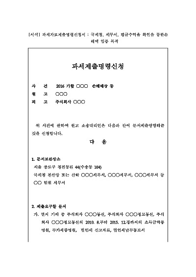 주요내용 : 소송 당사자가 법원에 신청하여, 세무서나 세관 등 과세관청이 보유한 상대방의 과세 관련 정보(소득, 재산 등)를 법원에 제출하도록 명령해달라고 요청하기 위한 목적으로 사용되어지는 신청서 양식임. 단 무단전재 방지목적으로 PDF 파일로 올리니, 구매하신 후 혹 원본 파일이 필요하신 분들은 톡이나 문자, 메일, 전화 등을 주시면 작성방법 등에 대한 간단한 무료상담과 함께 원본 파일을 보내드리도록 하겠습니다.