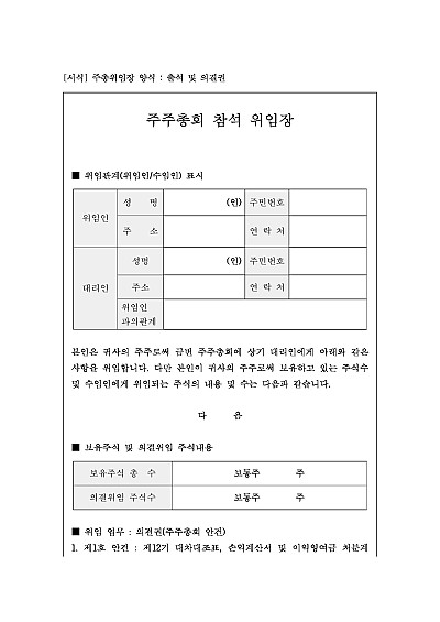 주요내용 : 주주가 직접 주주총회에 참석하여 의결권을 행사하기 어려울 대 자신의 의결권 행사 권한을 대리인에게 맡기기 위한 목적으로 사용되어지는 위임장 양식임. 단 무단전재 방지 목적으로 PDF 파일로 올리니구매하신 후 혹 원본 파일이 필요하신 분들은 톡이나 문자메일전화 등을 주시면 작성 방법 등에 대한 간단한 무료 상담과 함께 원본 파일을 보내드리도록 하겠습니다.