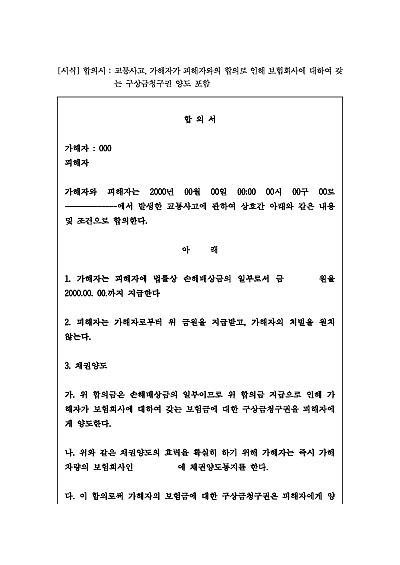 합의서 : 교통사고, 가해자가 피해자와의 합의로 인해 보험회사에 대하여 갖는 구상금청구권 양도 포함 요약정보 및 구매