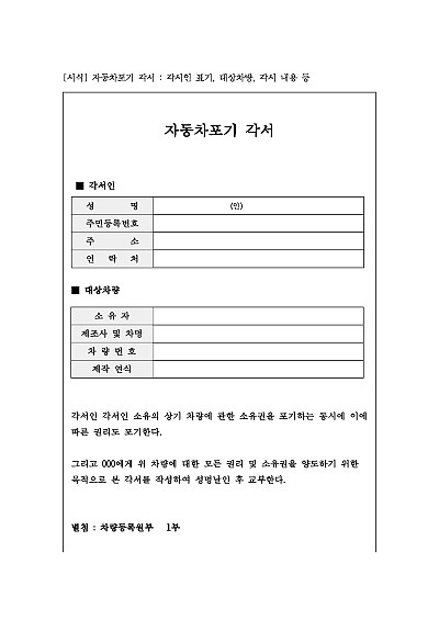 자동차포기 각서 : 각서인 표기, 대상차량, 각서 내용 등 요약정보 및 구매