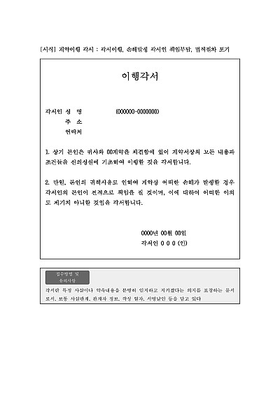 계약이행 각서 : 각서이행, 손해발생 각서인 책임부담, 법적절차 포기 요약정보 및 구매
