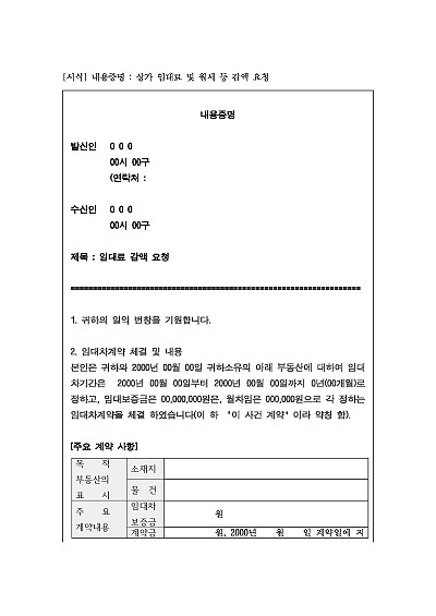 주요내용 : 임대차계약 체결 및 기간 만료에 따른 계약갱신의 의사표시와 함께 보증금, 차임 등의 감액을 요청할 때 사용되어지는 내용증명 양식임. 단 무단전재 방지목적으로PDF파일로 올리니,구매하신 후 혹 원본 파일이 필요하신 분들은 톡이나 문자,메일,전화 등을 주시면 작성방법 등에 대한 간단한 무료상담과 함께 원본 파일을 보내드리도록 하겠습니다.