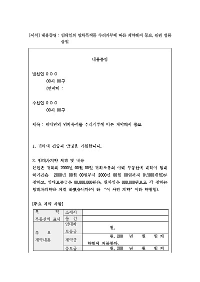 주요내용 : 임대착몌약 체결 후 목적물의 하자 보수에 대한 임대인의 보수의무 등 회피시 당해 행위를 원인으로 계약해지를 통지함으로써 상대방에게 법적 분쟁이 시작될 수 있음을 알리고 심리적 압박을 주어 소송 전 상대방의 자발적 이행 및 합의를 유도하기 위한 목적으로 사용되어지는 양식임. 단 무단전재 방지목적으로PDF파일로 올리니,구매하신 후 혹 원본 파일이 필요하신 분들은 톡이나 문자,메일,전화 등을 주시면 작성방법 등에 대한 간단한 무료상담과 함께 원본 파일을 보내드리도록 하겠습니다.