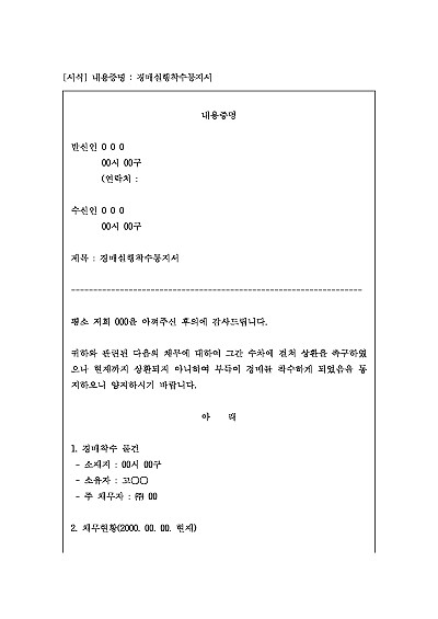 주요내용 : 대여금 등의 미변제를 이유로 채무자를 상대로 경매실행착수 통지함으로써 상대방에게 법적 분쟁이 시작될 수 있음을 알리고 심리적 압박을 주어 소송 전 상대방의 자발적 이행 및 합의를 유도하기 위한 목적으로 사용되어지는 양식임.단 무단전재 방지목적으로PDF파일로 올리니,구매하신 후 혹 원본 파일이 필요하신 분들은 톡이나 문자,메일,전화 등을 주시면 작성방법 등에 대한 간단한 무료상담과 함께 원본 파일을 보내드리도록 하겠습니다.