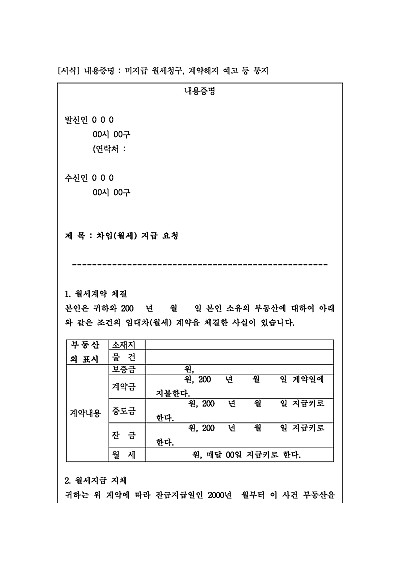 주요내용 : 월세계약체결, 임차인의 월세 미지급을 이유로 그 지급을 독촉하면서 계속된 지체시 계약이 해지될 수 있음을 통지함으로써 상대방에게 법적 분쟁이 시작될 수 있음을 알리고 심리적 압박을 주어 소송 전 상대방의 자발적 이행 및 합의를 유도하기 위한 목적으로 사용되어지는 양식임.단 무단전재 방지목적으로PDF파일로 올리니,구매하신 후 혹 원본 파일이 필요하신 분들은 톡이나 문자,메일,전화 등을 주시면 작성방법 등에 대한 간단한 무료상담과 함께 원본 파일을 보내드리도록 하겠습니다.