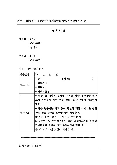 주요내용 : 금전대여 후 채무자의 채무불이행시 그 이행의 독촉 및 법적조치 예고 등을 통지함으로써 상대방에게 법적 분쟁이 시작될 수 있음을 알리고 심리적 압박을 주어 소송 전 상대방의 자발적 이행 및 합의를 유도하기 위한 목적으로 사용되어지는 양식임.단 무단전재 방지목적으로PDF파일로 올리니,구매하신 후 혹 원본 파일이 필요하신 분들은 톡이나 문자,메일,전화 등을 주시면 작성방법 등에 대한 간단한 무료상담과 함께 원본 파일을 보내드리도록 하겠습니다.
