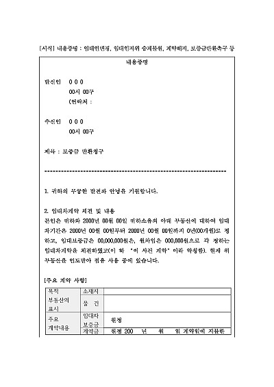 주요내용 : 임대차계약 중 건물매매로 인한 소유자 변경, 임차인의 임대인지위승계 불원 및 그에 따른 계약해지 통지, 계약금 등 반환을 통지함으로써 상대방에게 법적 분쟁이 시작될 수 있음을 알리고 심리적 압박을 주어 소송 전 상대방의 자발적 이행 및 합의를 유도하기 위한 목적으로 사용되어지는 양식임.단 무단전재 방지목적으로PDF파일로 올리니,구매하신 후 혹 원본 파일이 필요하신 분들은 톡이나 문자,메일,전화 등을 주시면 작성방법 등에 대한 간단한 무료상담과 함께 원본 파일을 보내드리도록 하겠습니다.