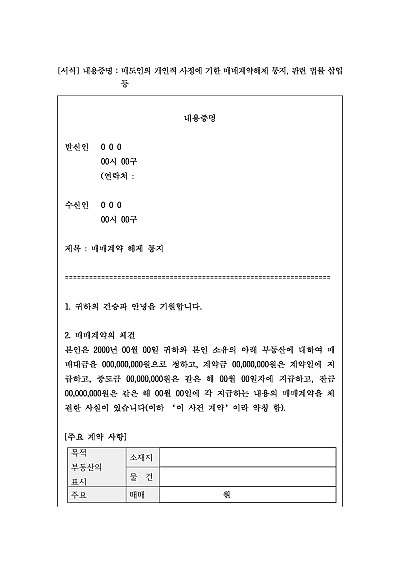 주요내용 : 매매계약 체결 후 상대방이 중도금의 지급 등 이행에 착수하기 전에 매도인이 계약금의 배액을 상환하고 매매계약 해제의 의사를 표시함으로써 상대방에게 법적 분쟁이 시작될 수 있음을 알리고 심리적 압박을 주어 소송 전 상대방의 자발적 이행 및 합의를 유도하기 위한 목적으로 사용되어지는 양식임. 단 무단전재 방지목적으로PDF파일로 올리니,구매하신 후 혹 원본 파일이 필요하신 분들은 톡이나 문자,메일,전화 등을 주시면 작성방법 등에 대한 간단한 무료상담과 함께 원본 파일을 보내드리도록 하겠습니다.
