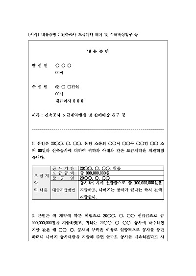 주요내용 : 건축공사 도급계약체결, 수급인의 공사지체로 인한 공기지연 등 손해발생을 이유로 당해 계약 해제 및 손해배상 등을 청구함으로써 상대방에게 법적 분쟁이 시작될 수 있음을 알리고 심리적 압박을 주어 소송 전 상대방의 자발적 이행 및 합의를 유도하기 위한 목적으로 사용되어지는 양식임.단 무단전재 방지목적으로PDF파일로 올리니,구매하신 후 혹 원본 파일이 필요하신 분들은 톡이나 문자,메일,전화 등을 주시면 작성방법 등에 대한 간단한 무료상담과 함께 원본 파일을 보내드리도록 하겠습니다.
