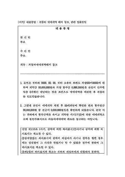 주요내용 : 자동차매매계약 체결 후 상대방의 기망행위를 이유로 당해 계약의 해지를 통지함으로써 상대방에게 법적 분쟁이 시작될 수 있음을 알리고 심리적 압박을 주어 소송 전 상대방의 자발적 이행 및 합의를 유도하기 위한 목적으로 사용되어지는 양식임.단 무단전재 방지목적으로PDF파일로 올리니,구매하신 후 혹 원본 파일이 필요하신 분들은 톡이나 문자,메일,전화 등을 주시면 작성방법 등에 대한 간단한 무료상담과 함께 원본 파일을 보내드리도록 하겠습니다.