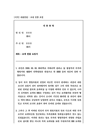 주요내용 : 영업사원의 기망행위에 속아 교재구매 후 그 반품을 통지함으로써 상대방에게 법적 분쟁이 시작될 수 있음을 알리고 심리적 압박을 주어 소송 전 상대방의 자발적 이행 및 합의를 유도하기 위한 목적으로 사용되어지는 양식임.단 무단전재 방지목적으로PDF파일로 올리니,구매하신 후 혹 원본 파일이 필요하신 분들은 톡이나 문자,메일,전화 등을 주시면 작성방법 등에 대한 간단한 무료상담과 함께 원본 파일을 보내드리도록 하겠습니다.