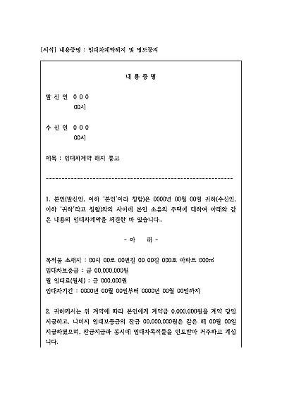 주요내용 : 임대차계약체결 후 임대인이 계약만료에 따른 계약해지 및 명도통지 등을 할 목적으로 사용되어지는 내용증명 양식임. 단 무단전재 방지목적으로PDF파일로 올리니,구매하신 후 혹 원본 파일이 필요하신 분들은 톡이나 문자,메일,전화 등을 주시면 작성방법 등에 대한 간단한 무료상담과 함께 원본 파일을 보내드리도록 하겠습니다.