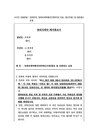 주요내용 : 임대인측에서 임대차(전세계약)기간 만료에 따라 계약 갱신거절의사표시를 하고 만료 당일 명도와 보증금 반환이 동시에 이루어 지기를 통지함으로써 상대방에게 법적 분쟁이 시작될 수 있음을 알리고 심리적 압박을 주어 소송 전 상대방의 자발적 이행 및 합의를 유도하기 위한 목적으로 사용되어지는 양식임. 단 무단전재 방지목적으로 PDF 파일로 올리니, 구매하신 후 혹 원본 파일이 필요하신 분들은 톡이나 문자, 메일, 전화 등을 주시면 작성방법 등에 대한 간단한 무료상담과 함께 원본 파일을 보내드리도록 하겠습니다.