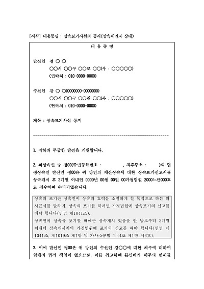 주요내용 : 상속개시 후 3개월 이내 상속포기를 함으로써 상속의 효력을 소멸케하고, 상속채권자들의 상속인에 대한 채무변제를 독촉하는 일을 차단하기 위한 목적으로 사용되어지는 양식임. 단 무단전재 방지목적으로 PDF 파일로 올리니, 구매하신 후 혹 원본 파일이 필요하신 분들은 톡이나 문자, 메일, 전화 등을 주시면 작성방법 등에 대한 간단한 무료상담과 함께 원본 파일을 보내드리도록 하겠습니다.
