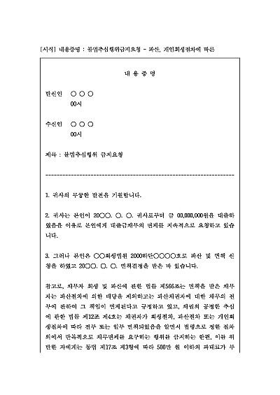 주요내용: 파산이나 면책 등의 결정을 받게 될 경우 파산절차에 의한 배당을 제외하고는 파산채권자에 대한 채무의 전부가 면제되는 바, 그러한 사실을 파산채권자에게 고지하여 불법추심행위를 방지하기 위한 목적으로 사용되어지는 양식임. 단 무단전재 방지목적으로PDF파일로 올리니,구매하신 후 혹 원본 파일이 필요하신 분들은 톡이나 문자,메일,전화 등을 주시면 작성방법 등에 대한 간단한 무료상담과 함께 원본 파일을 보내드리도록 하겠습니다.