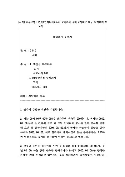 주요내용 : 건축(인테리어)공사계약체결, 계약상 공사기간 도과 및 추가공사대금 요구 등의 사용로 당해 계약을 해지할 목적으로 사용되어지는 양식임. 단 무단전재 방지목적으로 PDF 파일로 올리니, 구매하신 후 혹 원본 파일이 필요하신 분들은 톡이나 문자, 메일, 전화 등을 주시면 작성방법 등에 대한 간단한 무료상담과 함께 원본 파일을 보내드리도록 하겠습니다.