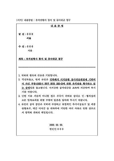 주요내용 : 공사도급계약 체결 및 공사완공을 하였지만 공사대금 미지급시 당해 건축물에 대한 유치권행사 및 공사대금지급을 통지함으로써 상대방에게 법적 분쟁이 시작될 수 있음을 알리고 심리적 압박을 주어 소송 전 상대방의 자발적 이행 및 합의를 유도하기 위한 목적으로 사용되어지는 양식임. 단 무단전재 방지목적으로 PDF 파일로 올리니, 구매하신 후 혹 원본 파일이 필요하신 분들은 톡이나 문자, 메일, 전화 등을 주시면 작성방법 등에 대한 간단한 무료상담과 함께 원본 파일을 보내드리도록 하겠습니다.