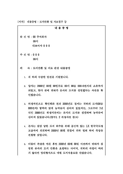 주요내용 : 경계침범으로 인한 토지반환 및 지료청구 목적의 내용증명으로, 상대방에게 법적 분쟁이 시작될 수 있음을 알리고 심리적 압박을 주어 소송 전 상대방의 자발적 이행 및 합의를 유도하기 위한 목적으로 사용되어지는 양식임. 단 무단전재 방지목적으로 PDF 파일로 올리니, 구매하신 후 혹 원본 파일이 필요하신 분들은 톡이나 문자, 메일, 전화 등을 주시면 작성방법 등에 대한 간단한 무료상담과 함께 원본 파일을 보내드리도록 하겠습니다.