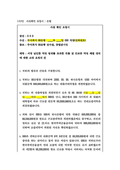 주요내용 : 은행대출 시 서명 날인한 약정 범위를 초과한 대출 및 근보증 약정 체결경위에 대한 소명요청을 구하기 위한 목적으로 사용되어지는 요청서 양식임. 단 무단전재 방지목적으로 PDF 파일로 올리니, 구매하신 후 혹 원본 파일이 필요하신 분들은 톡이나 문자, 메일, 전화 등을 주시면 작성방법 등에 대한 간단한 무료상담과 함께 원본 파일을 보내드리도록 하겠습니다.