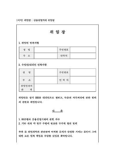 주요내용 : 본인이 아닌 대리인이 금융 거래를 할 수 있도록 권한을 부여하는 문서 양식임. 단 무단전재 방지 목적으로 PDF 파일로 올리니, 구매하신 후 혹 원본 파일이 필요하신 분들은 톡이나 문자, 메일, 전화 등을 주시면 작성 방법 등에 대한 간단한 무료 상담과 함께 원본 파일을 보내드리도록 하겠습니다.