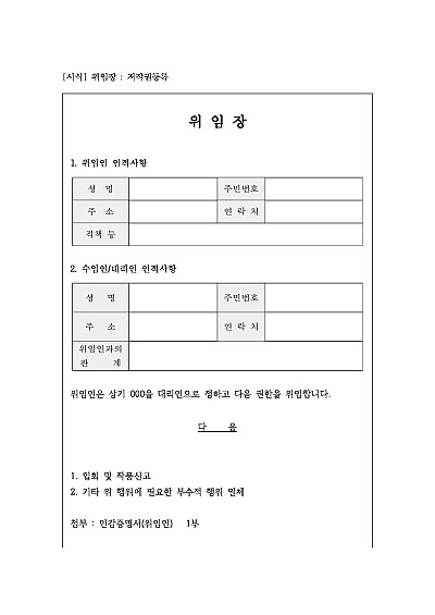 주요내용: 위임인이 수임인에게 자신의 특정 업무나 법률 행위를 대신 처리해 달라고 위탁하는 권한을 증명하기 위해 작성되는 문서 양식임.단 무단전재 방지 목적으로PDF파일로 올리니,구매하신 후 혹 원본 파일이 필요하신 분들은 톡이나 문자,메일,전화 등을 주시면 작성 방법 등에 대한 간단한 무료 상담과 함께 원본 파일을 보내드리도록 하겠습니다.