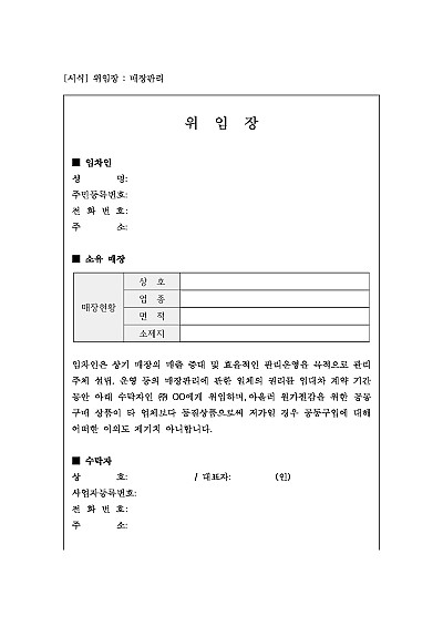 주요내용: 위임인이 수임인에게 자신의 특정 업무나 법률 행위를 대신 처리해 달라고 위탁하는 권한을 증명하기 위해 작성되는 문서 양식임.단 무단전재 방지 목적으로PDF파일로 올리니,구매하신 후 혹 원본 파일이 필요하신 분들은 톡이나 문자,메일,전화 등을 주시면 작성 방법 등에 대한 간단한 무료 상담과 함께 원본 파일을 보내드리도록 하겠습니다.