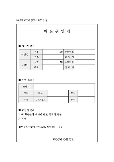 주요내용 매도인이 직접 계약에 참여하기 어려울 때, 3(대리인)에게 부동산을 매매하는 모든 권한을 위임한다는 것을 증명하는 문서 양식임. 단 무단전재 방지 목적으로 PDF 파일로 올리니구매하신 후 혹 원본 파일이 필요하신 분들은 톡이나 문자메일전화 등을 주시면 작성 방법 등에 대한 간단한 무료 상담과 함께 원본 파일을 보내드리도록 하겠습니다.