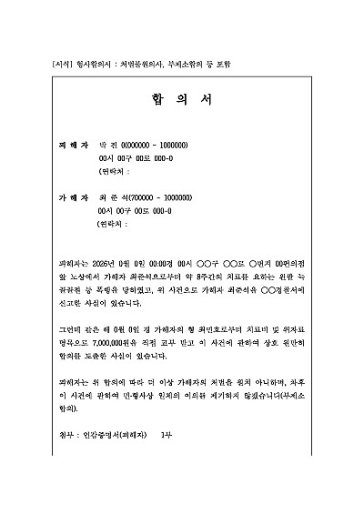 주요내용 : 범죄 가해자가 형사처벌을 감경받거나 피하기 위해 피해자에게 합의금 등 보상을 제공하고, 대신 피해자로부터 '처벌불원 의사'를 받아 법원에 제출하는 문서 양식임. 단 무단전재 방지 목적으로 PDF 파일로 올리니, 구매하신 후 혹 원본 파일이 필요하신 분들은 톡이나 문자, 메일, 전화 등을 주시면 작성 방법 등에 대한 간단한 무료 상담과 함께 원본 파일을 보내드리도록 하겠습니다.